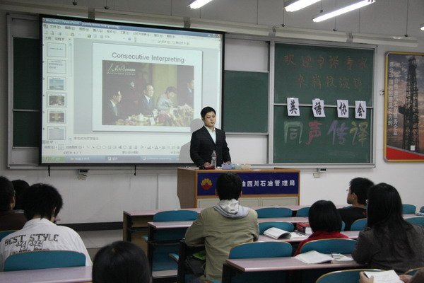 10月22日晚7点,由我校英语协会承办,中国对外翻译出版公司余洋老师主讲的“同声传译”讲座在三教110教室举行。