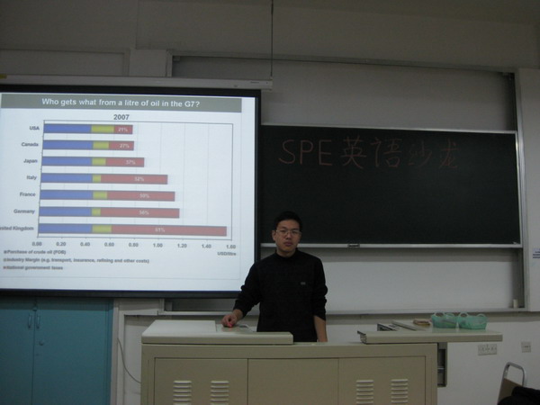 SPE学生分会学术部部长张永宾做了关于油价与石油收益的演讲,同学们针对演讲内容进行提问,演讲结束后同学们结合各自的专业知识对油价与石油收益话题进行了分组讨论。整个过程全部用英语进行,在丰富了同学们专业知识的同时也锻炼了英语口语,提高了英语水平。