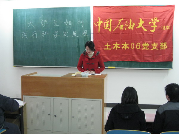 3月30日,土木本06党支部三教406举行了“深入学习实践科学发展观系列活动之‘做一次讨论,读一本理论专著,写一篇学习心得’”的主题党日活动。