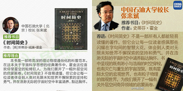 22日,中国日报官方微博推出了9位知名校长的推荐书单;24日,人民日报官方微博、教育部新闻办公室官方微博“微言教育”共同推出了24位知名大学校长及书记推荐书单。张来斌推荐的《时间简史》入选三家媒体推荐书单,书单被多家媒体和高校官方微博评论转发。