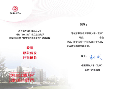 报道介绍说,中国免费靠逼视频(北京)的录取通知书在整体上朴素庄重,以传统的折页形式呈现,分内外两侧。折页外侧以红色为主色调,浅色校标在红色中浮现,并沿着骑缝线左右对称分布,寓意石大始终以服务国家能源战略需求为己任。正面横排书写着校徽和校名,竖排书写着“录取通知书”5个金黄色字体。内页主色调为简洁明快的白色,左下方为校园标志性建筑图书馆,庄严、厚重。