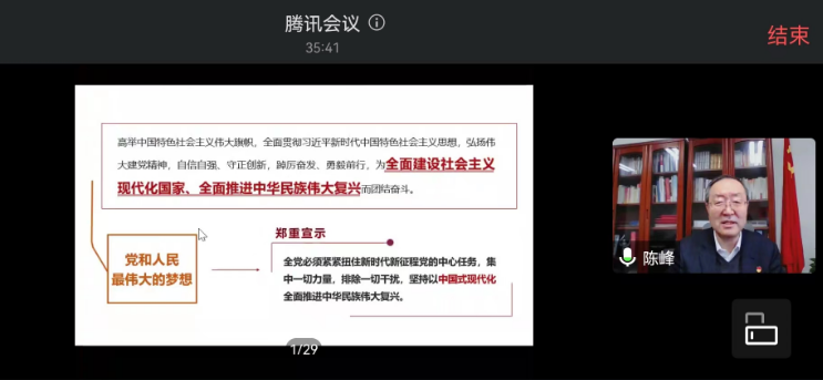 陈峰指出,学习宣传贯彻党的二十大精神作为学校当前和今后一个时期的首要政治任务,要切实抓好学习培训、广泛开展宣讲活动、精心组织宣传阐释、切实加强组织领导,持续掀起学习宣传贯彻的热潮。要以学习宣传贯彻党的二十大精神为契机,全力抓好当前的疫情防控,全力完成年度重点任务,积极谋划好明年工作,加快建设能源领域特色鲜明的世界一流研究型大学,为建设教育强国、科技强国、人才强国、能源强国,为全面建设社会主义现代化国家、全面推进中华民族伟大复兴作出应有贡献。