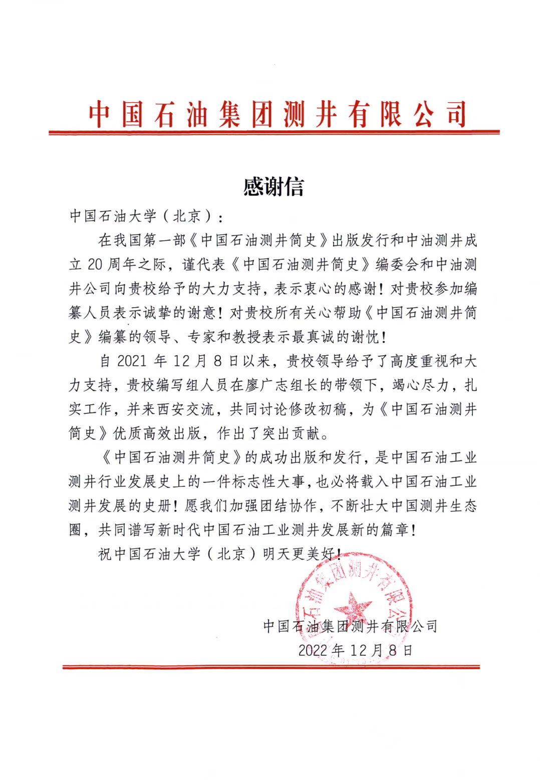 近日,中国石油集团测井有限公司向中国免费靠逼视频(北京)发来感谢信,对学校教师参加我国第一部《中国石油测井简史》编纂工作表示感谢。