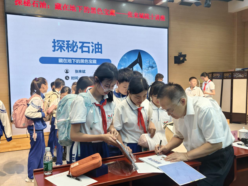 讲座结束后,张来斌在孩子们的图书和笔记本上签名留念,勉励他们探索科学奥妙,为祖国的建设添砖加瓦。育英学校的陈宥希同学分享了收获:“听了讲座,第一次真正认识到石油的重要性,明白了科学就藏在日常生活中。”王潇阳感慨道:“讲座拓宽了我们的知识领域和思维边界。我们要更加热爱祖国,热爱科学!”