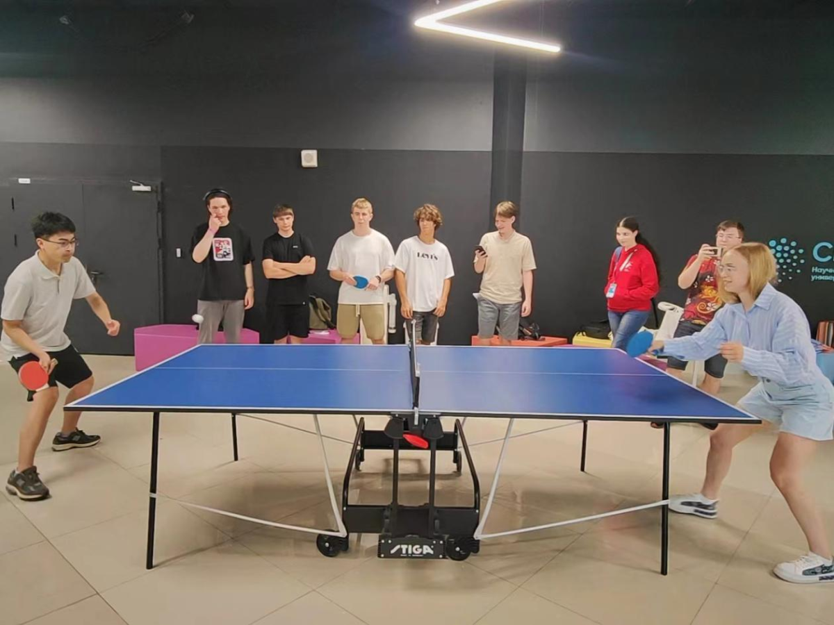 在索契天狼星科技大学,营员参观了科研楼,与基因和生命科学研究中心、信息科学与人工智能研究中心负责人进行交流,了解了该校的整体情况和科研实力。来自中石大的三位营员将汉语版俄罗斯文学著作、汉语现代诗集等个人书籍捐赠给该校。夏令营还特别增设了中国主题开放交流活动,当地学生就中国教育、美食、文化、旅游等感兴趣的话题与营员进行了热烈讨论,双方开展了乒乓球友谊赛。