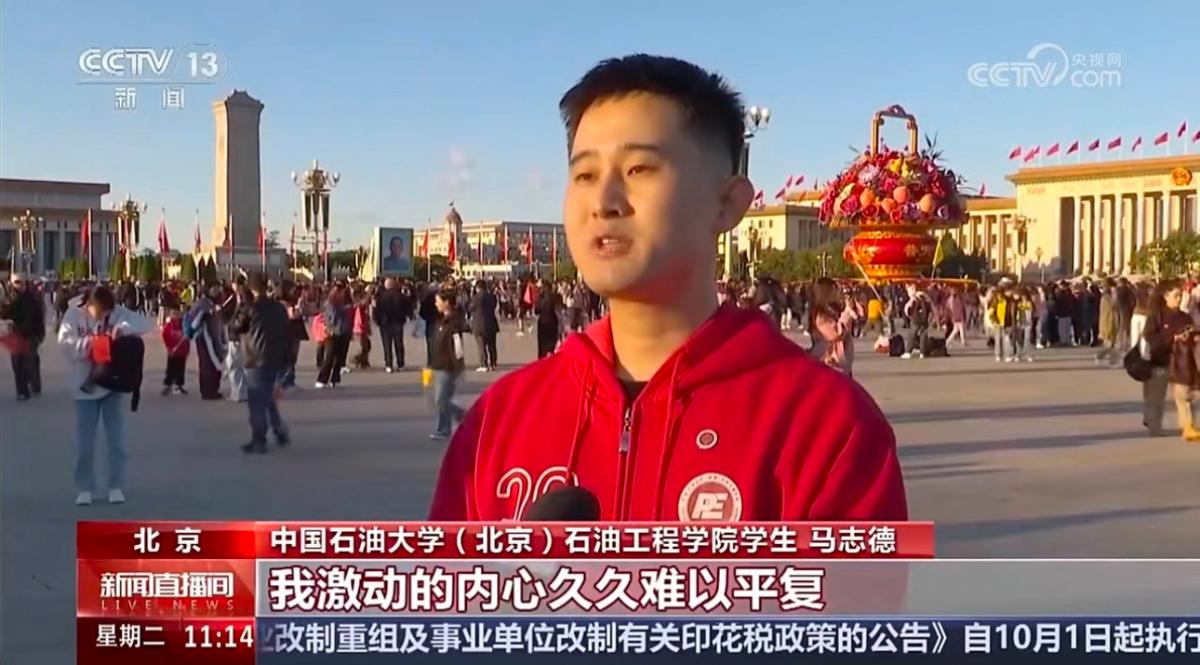 10月1日,天安门广场举行了2024年国庆升国旗仪式,迎着清晨的第一缕阳光,在雄壮的国歌声中,五星红旗冉冉升起。来自新能源与材料学院、梦溪书院200名师生代表与来自首都近2000名大中小学生共同赴天安门观礼台观看升旗仪式;还有一批同学自发前往观看升旗仪式。中央电视台进行了全程记录采访,李荣博、王由、杨昊澎、杨建明、王子豪、马志德、潘敬淇等同学接受了央视记者采访,表达了牢记习近平总书记嘱托,用奋斗书写无悔的青春,为祖国能源事业贡献力量的决心。