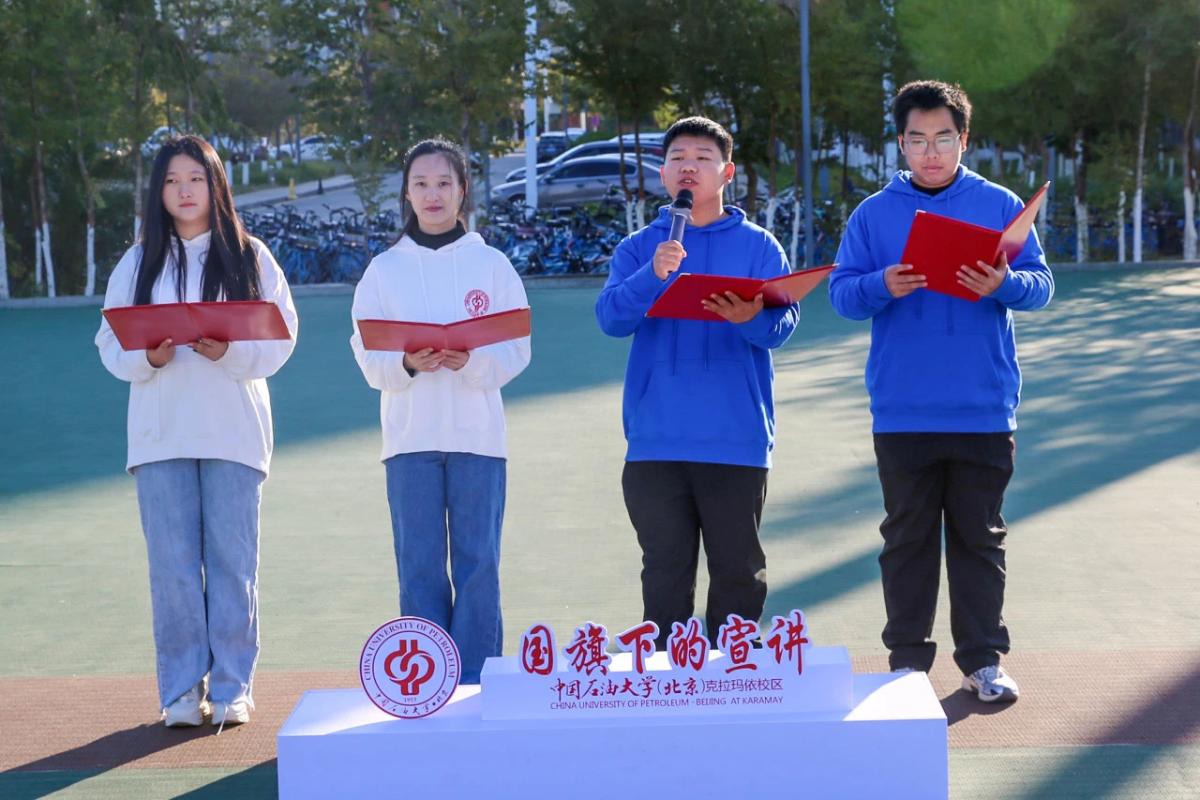 克拉玛依校区也在红旗操场举行了国庆升旗仪式,全体在校新生和辅导员参加活动,高唱雄壮的国歌旋律,诵读爱国诗篇《我的祖国》,活动现场涌动着澎湃的爱国热情。