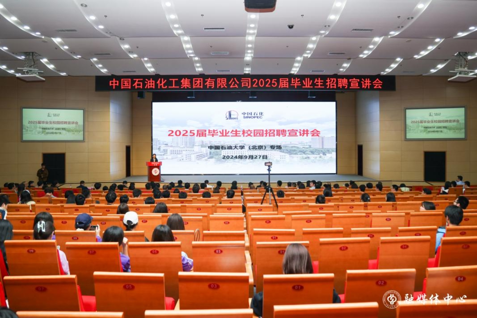9月27日,中国石油化工集团有限公司党组组织部(人力资源部、党组编制办)培训开发室主任杨俊,中国石化工程建设有限公司副总经理董汪平,中国石化石油工程技术研究院党委副书记、纪委书记、工会主席朱振中,带队来中石大举办2025届毕业生校园招聘宣讲会,中国石化下属60余家企业,120余位代表到校招聘。学校党委副书记文永红参加宣讲会并致欢迎辞。就业指导中心负责人、各学院学生工作负责人、毕业班辅导员以及400余名毕业生现场参加宣讲会。宣讲会线上同步直播,6000余名师生在线收看。