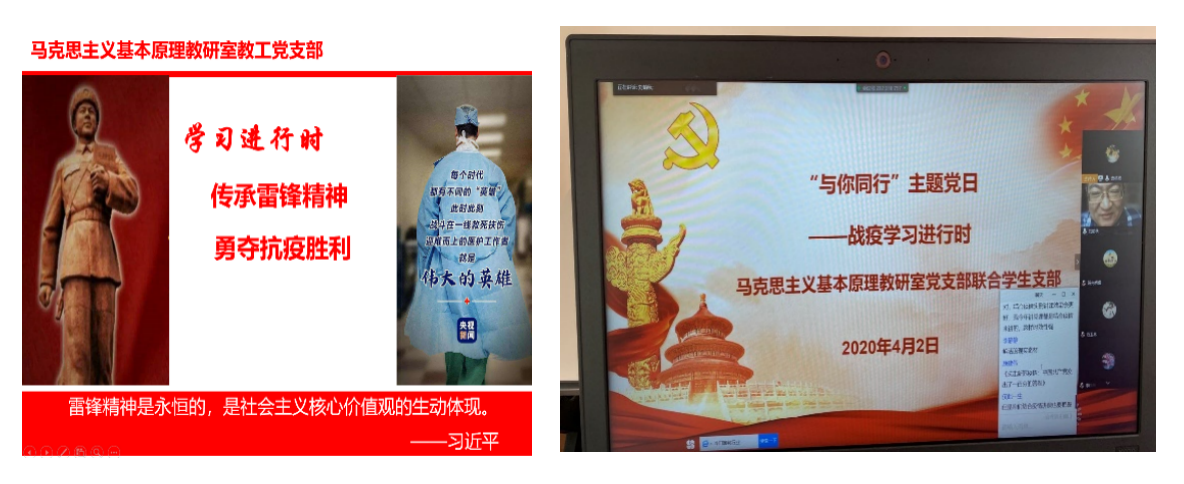 新冠肺炎疫情防控期间,中国石油大学马克思主义学院马克思主义原理教研室党支部借助雨课堂、腾讯会议平台以“万众一心,共克时艰”“传承雷锋精神,勇夺抗疫胜利”“与你同行,战疫学习进行时”为主题开展党日活动,组织党员潜心学,鼓励党员跟进讲,激发党员躬身做。