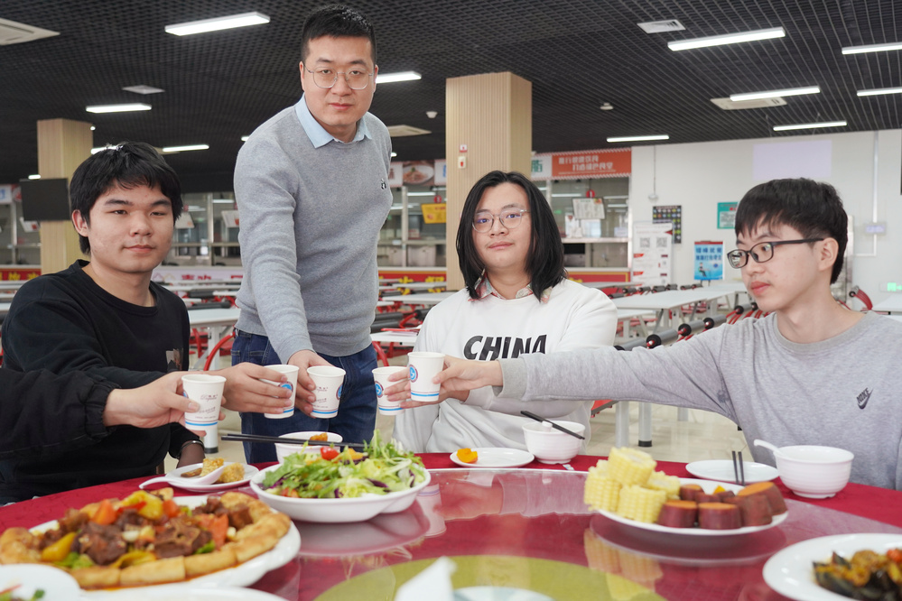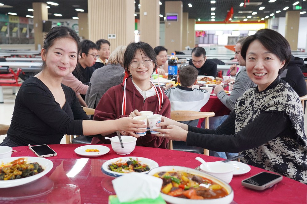 团年饭现场,师生共同举杯,致以美好祝愿。餐厅为师生们准备了丰盛的团年饭,美味可口的饭菜里溢出的是师生同心的温暖与幸福。