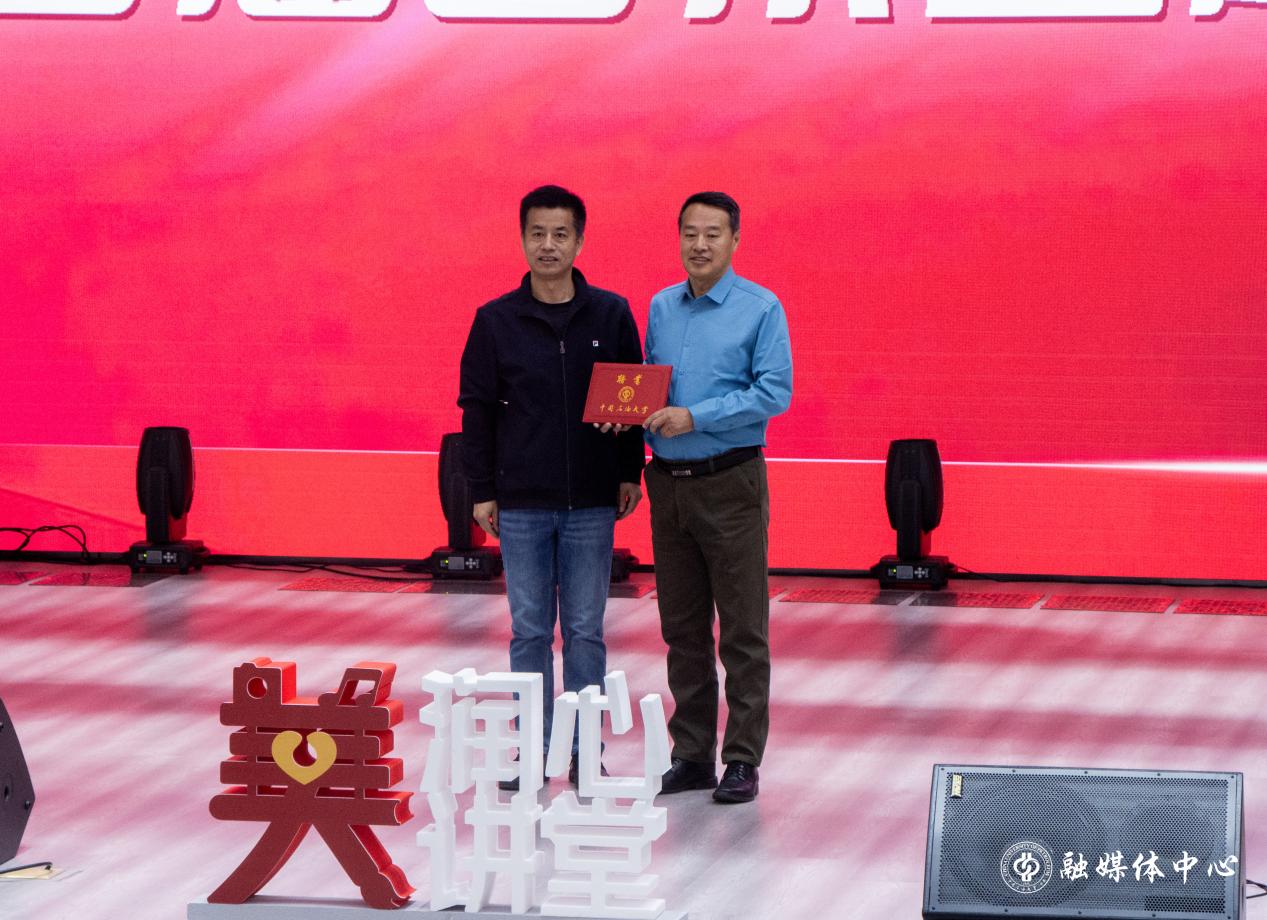 王永桦用专业且富有感染力的嗓音,带领同学们一同高歌。歌声回荡在音乐厅的每一个角落。临近尾声,他深情演唱《你是一面旗》。体育与人文艺术学院院长唐亮为王永桦颁发润心讲堂专家聘书。