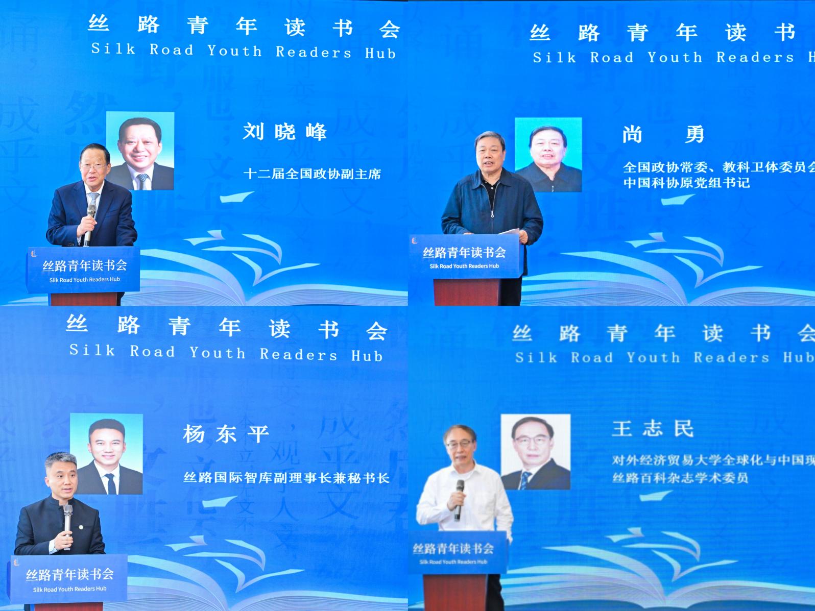 读书会现场,第十二届全国政协副主席刘晓峰、全国政协常委尚勇、对外经贸大学王志民教授等嘉宾与青年代表共聚一堂,分享阅读心得。刘晓峰勉励青年以开放心态拥抱多元文化,通过阅读拓宽视野,推动不同文明相互尊重、和合共生;尚勇给出了针对阅读的建设性建议;丝路国际智库秘书长杨东平希望青年以阅读为纽带,传承文明、激发创新,共建“云端丝路青年书院”。