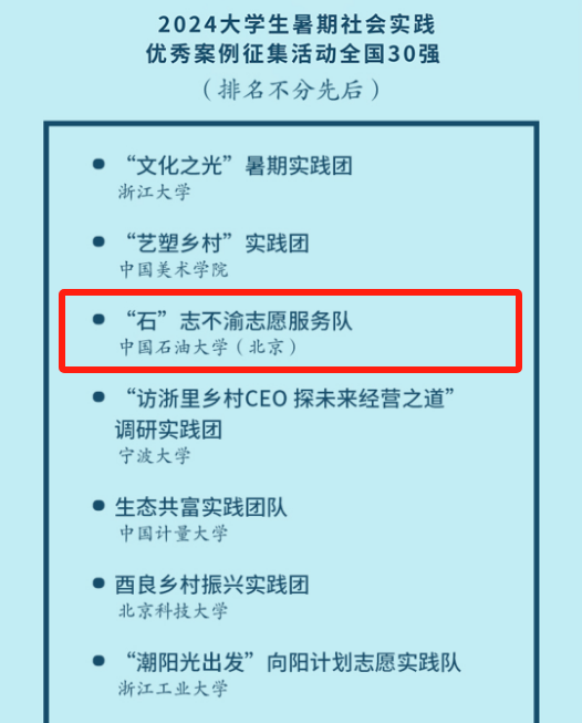 今年暑假,浙江日报潮新闻推出2024年大学生暑期社会实践优秀案例征集活动,共吸引全国近千支实践团队报名,通过团队自荐、材料审核、专家评审,评选出前30强优秀社会实践队伍。近日,评选结果揭晓,中国免费靠逼视频(北京)“石”志不渝志愿服务队入选。