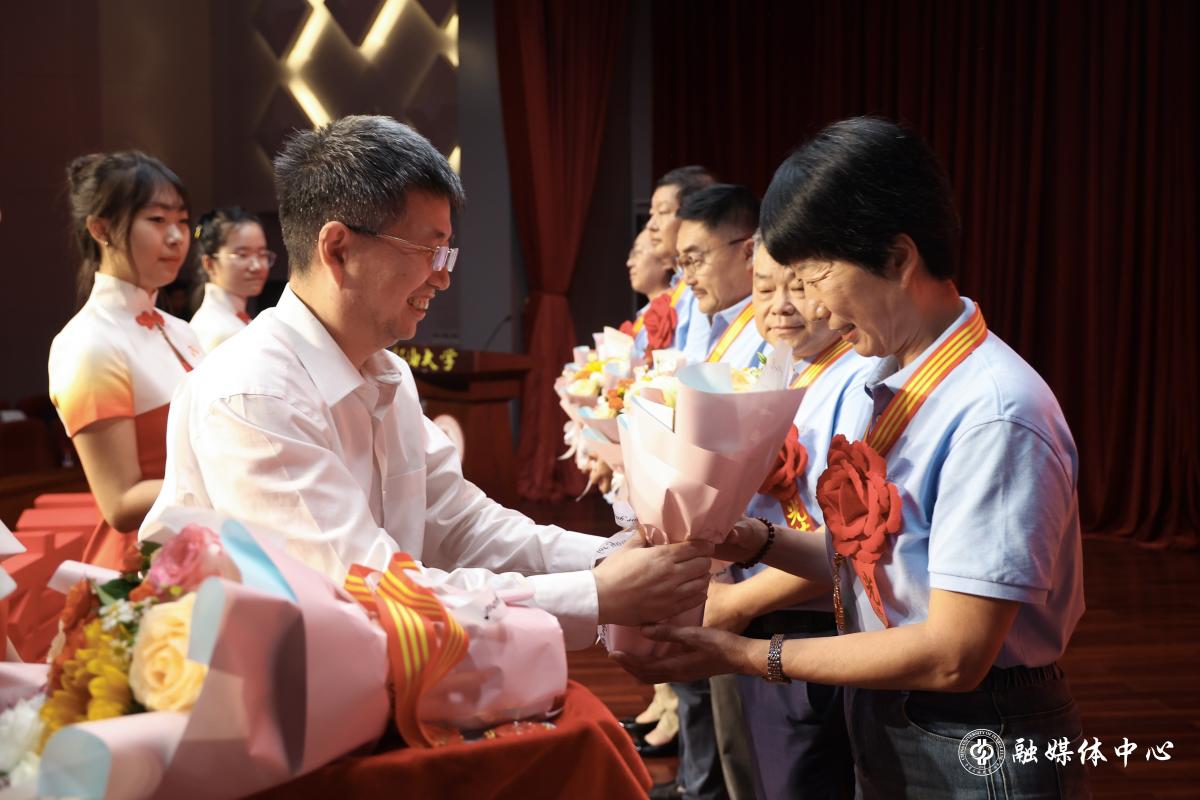 荣休典礼上,金衍为荣休教师代表颁发纪念奖章,镌刻每位教师姓名及在校年限的奖章,凝结着学校对他们躬耕教坛、爱岗敬业、默默奉献的致敬和美好祝福。
