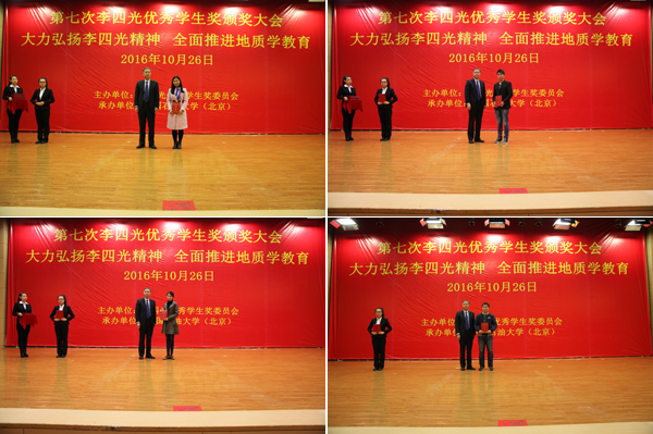 高润生宣读了关于颁发第七次李四光优秀学生奖的决定。伴随着高亢的《勘探队员之歌》,彭齐鸣为荣获第七次李四光优秀学生奖的获奖者颁奖。