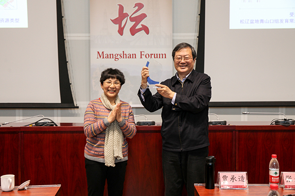 贾承造院士为石大带来精彩的首期“蟒山讲坛”专题报告,报告结束后,山红红为贾承造院士颁发“蟒山讲坛”纪念牌。
