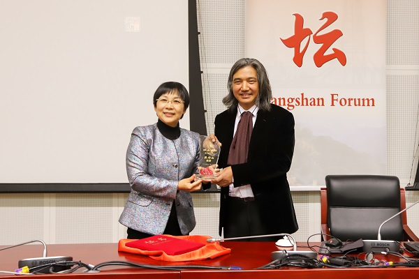 张来斌主持报告会。山红红为吴为山颁发了“蟒山讲坛”纪念牌。