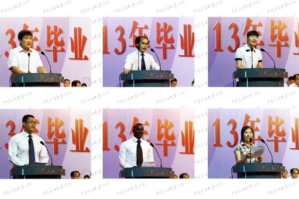 毕业本科生代表、化学工程学院的吴丹阳,毕业研究生代表、石油工程学院的张振欣,毕业留学生代表、卡塔尔籍石油工程专业的阿布分别发言,表达了对母校和老师的感谢、对同学的惜别之情;在校生代表、工商管理学院的高新致欢送辞,表达了对学长学姐的良好祝愿;教师代表、地球科学学院的吴胜和教授嘱托同学们以后要继续学习、追求卓越;家长代表、第四石油机械厂副厂长池胜高表达了对学校的感谢和对毕业生的祝福。
