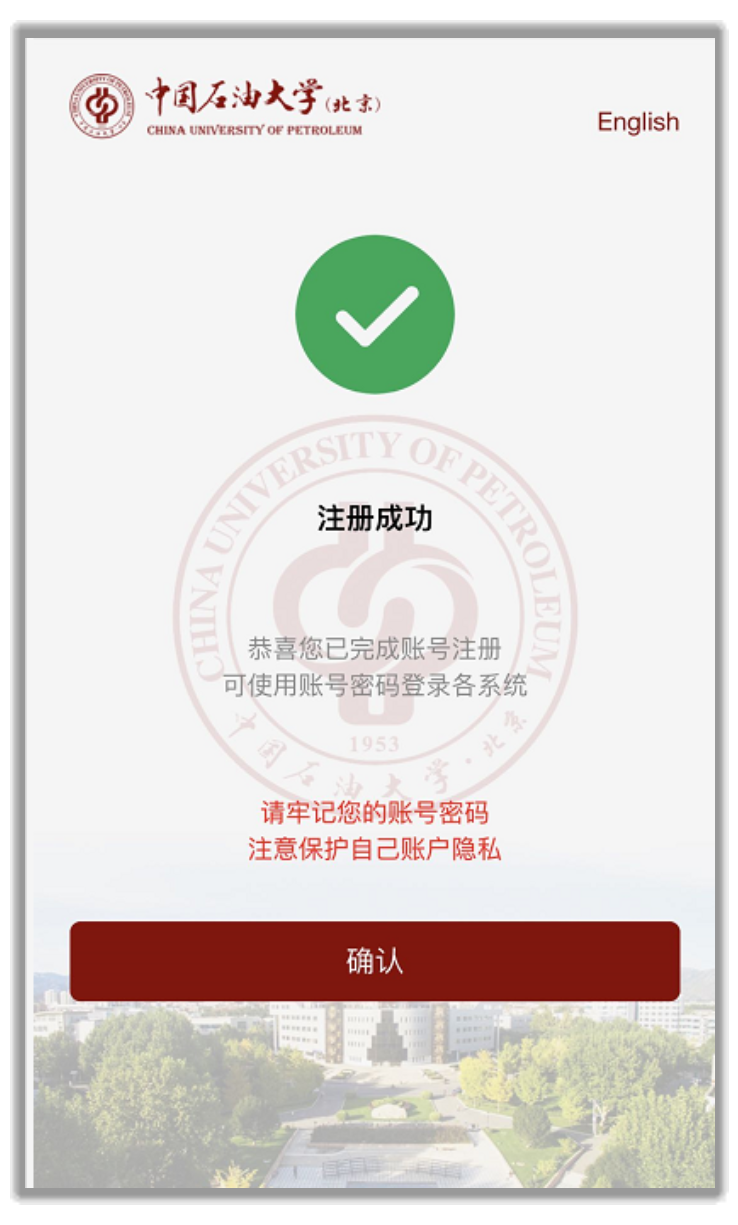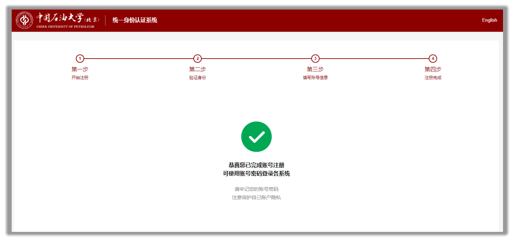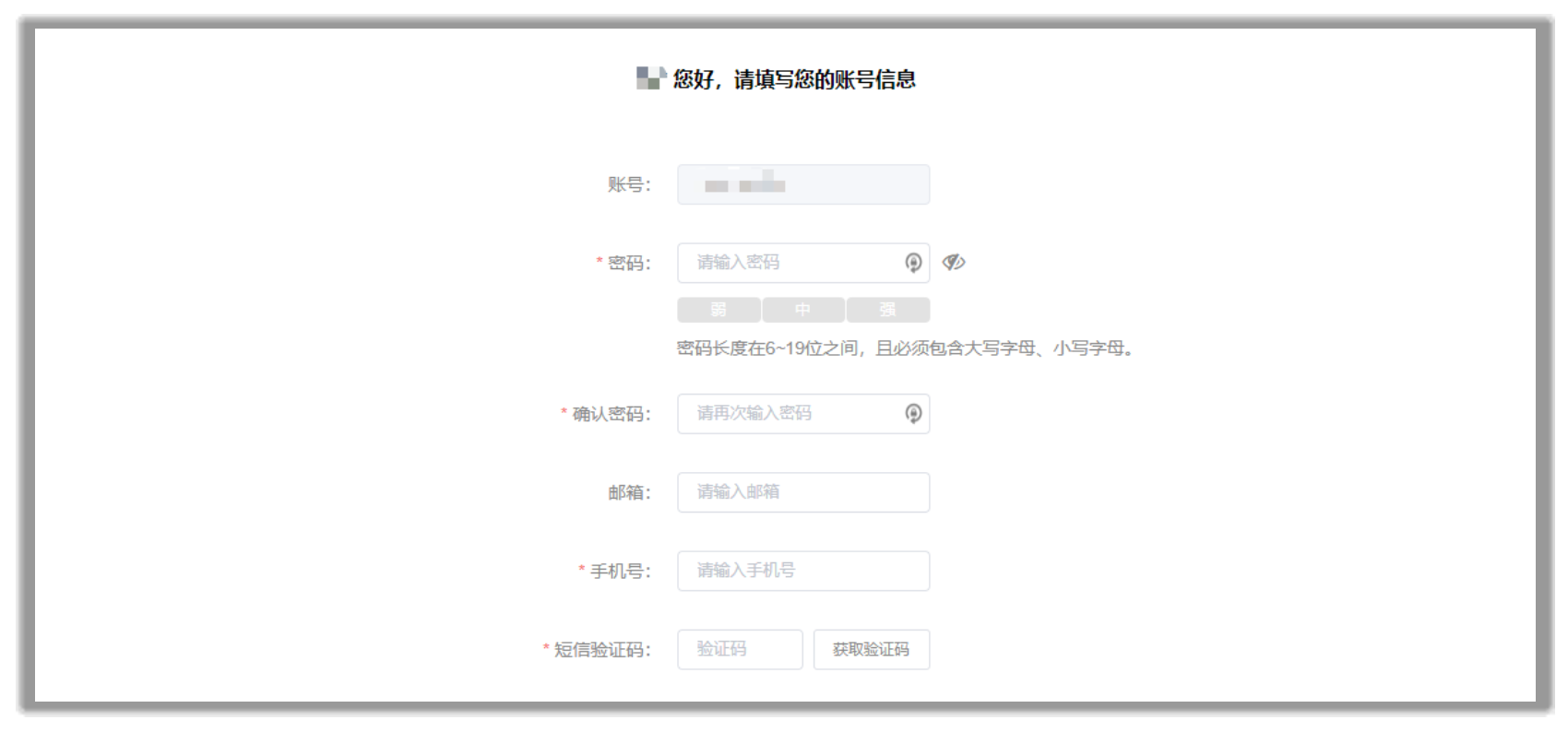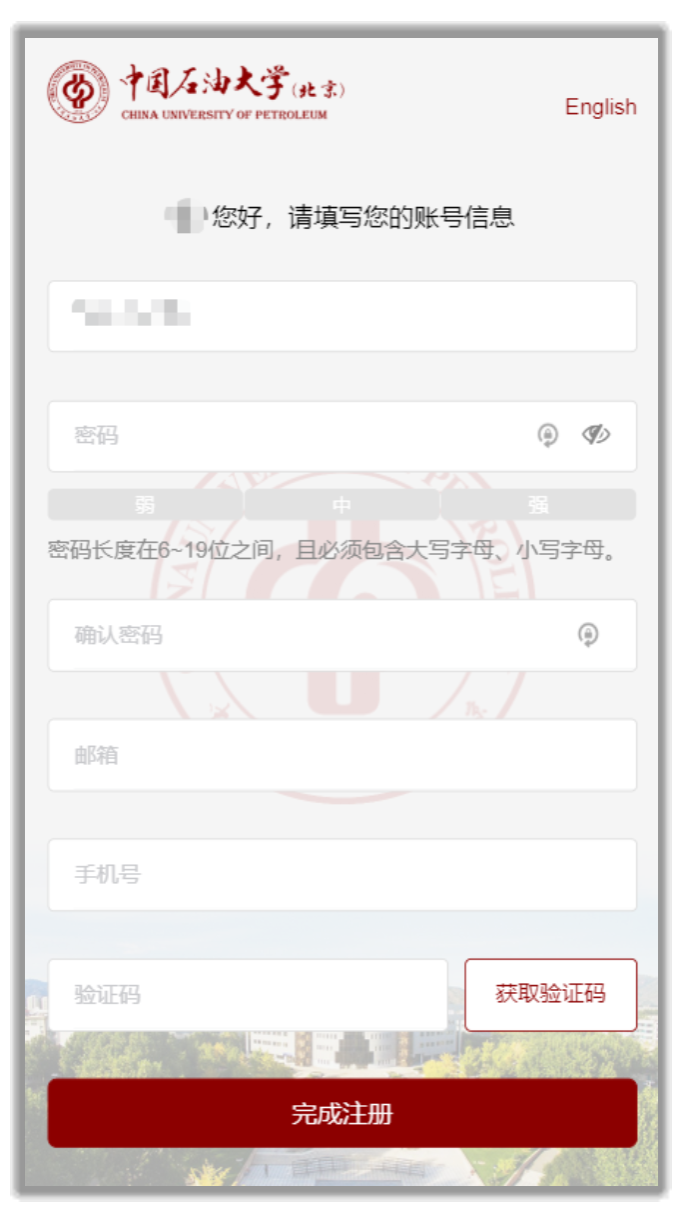 4、填写账号相关信息:密码、个人邮箱、手机,并获取短信验证码后填入,账号默认为学号/工号,无需修改,点击“完成注册”,若信息检验失败请根据提示进一步完善信息,若信息无误则跳转至注册成功页面,此时关闭页面即可。可通过学号/工号及注册过程中设置的个人密码登录已接入统一认证的应用系统。