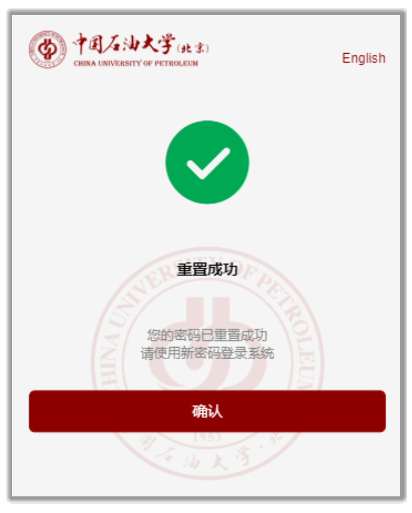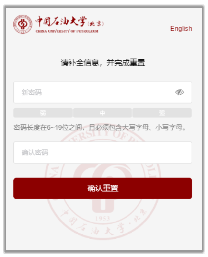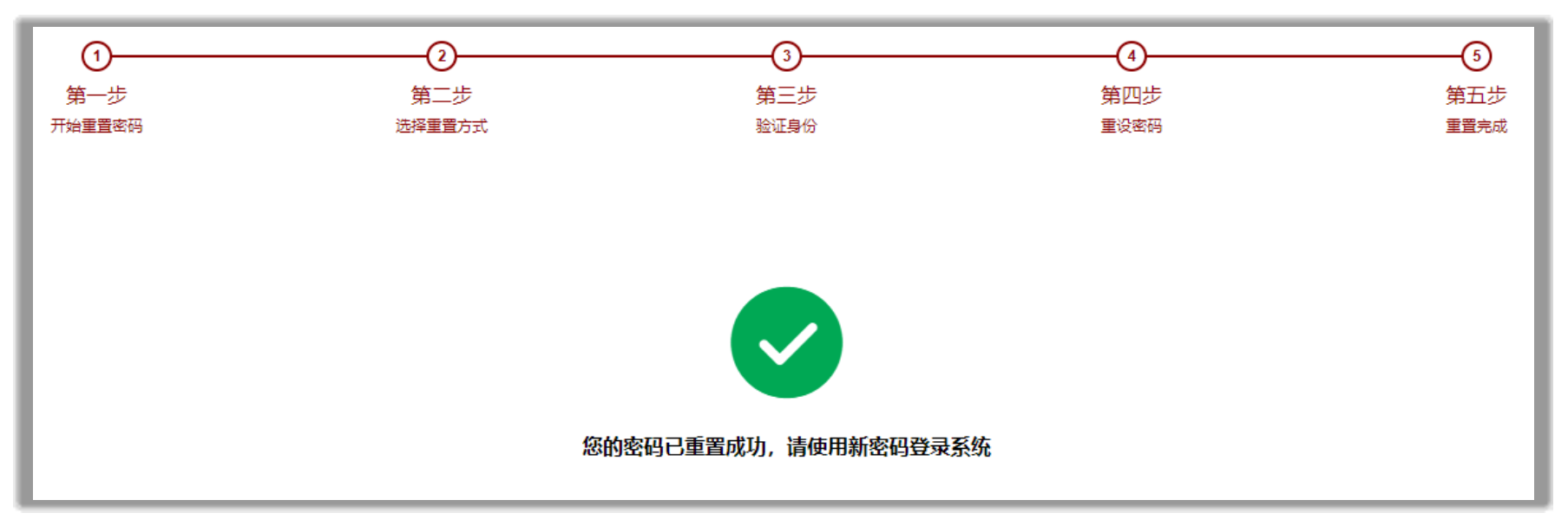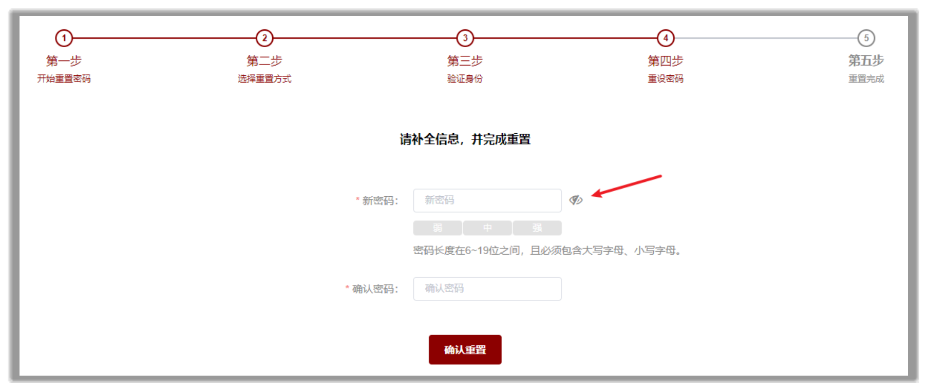 输入您选择的新密码,点击第一个文本框内的眼形图标则文本款内显示密码明文,此时只需输入一遍密码,再次点击关闭明文密码显示。点击“确认重置”,若密码符合系统强度要求,则页面提示密码重置成功,可使用新密码登录系统。