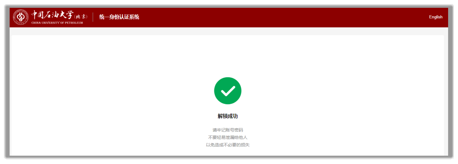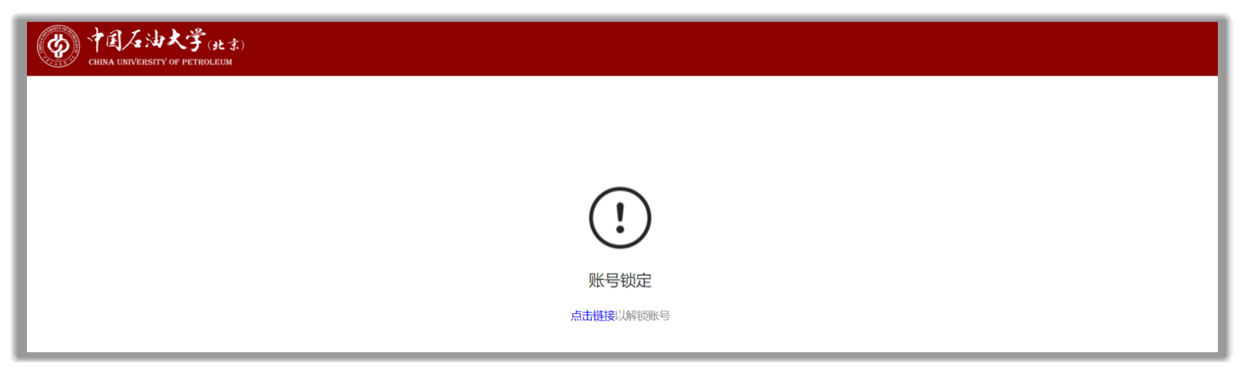若登录后未跳转至应用系统,进入账号锁定提示页面(如下图),说明您的账号长时间未修改密码或遭受了暴力破解,为保障账号安全,系统已为您自动锁定了账号,请点击页面链接进行自主解锁,以下以PC端自助解锁为例,移动端类似。