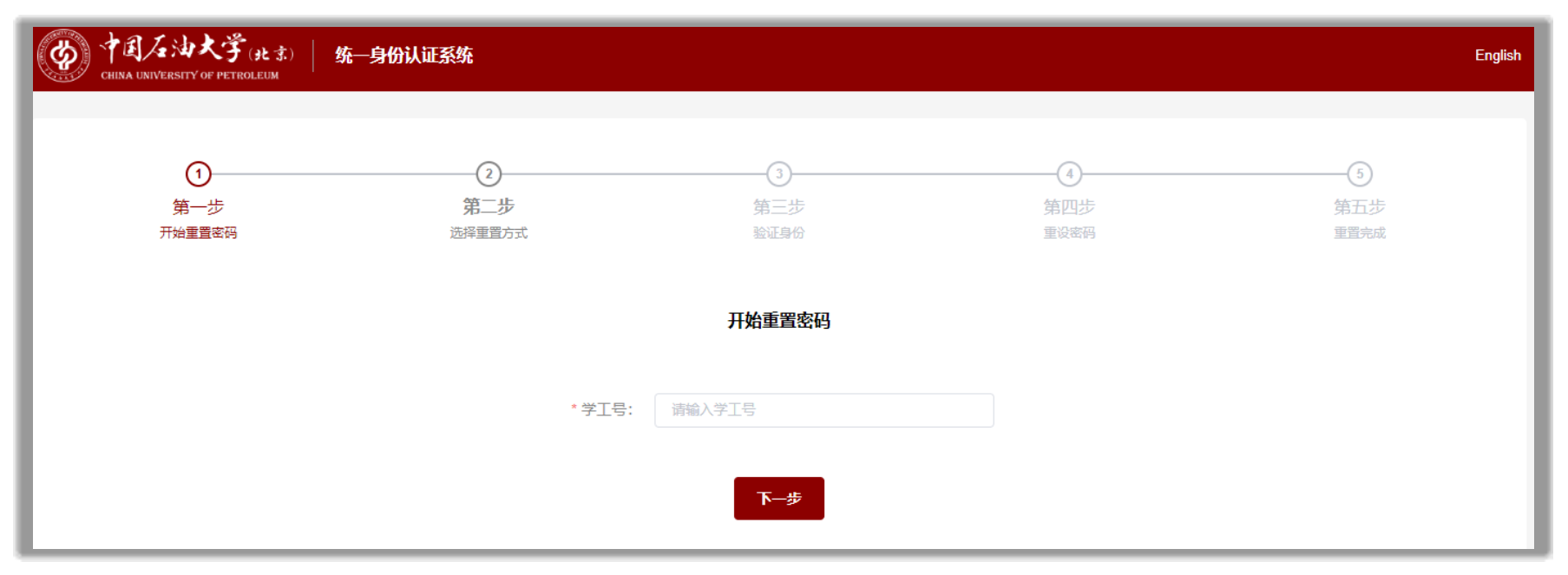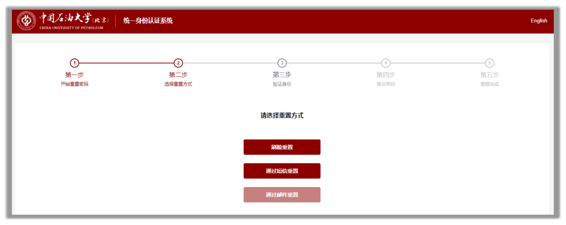 1、输入学号/工号,点击下一步,系统会列出三种密码重置的方式:刷脸重置、通过短信重置、通过邮件重置。根据您在统一认证系统中的信息完整性不同,可选择方式对应的按钮会亮起。