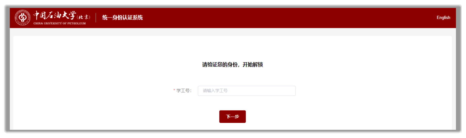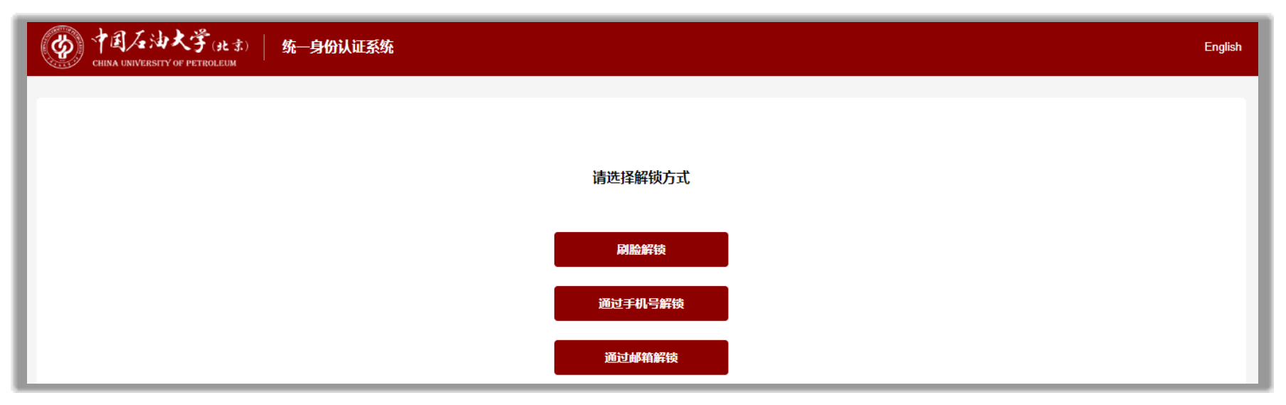 2、身份验证,根据您在统一认证系统中的信息完整性不同,可选择方式对应的按钮会亮起。各解锁方式的操作过程与面重置一致,完成身份验证则账号自动解锁。