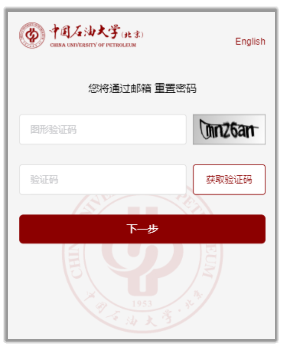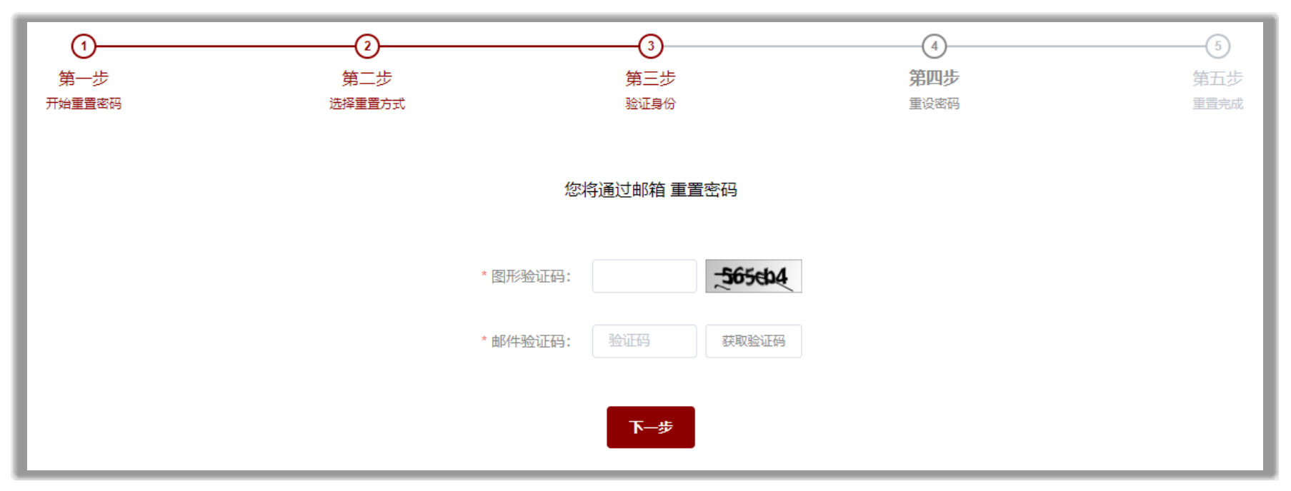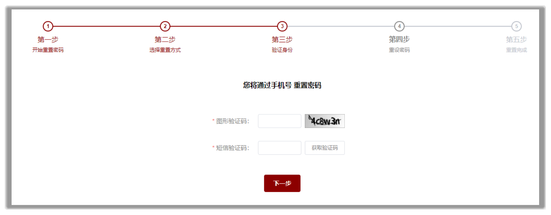 输入图形验证码并点击“获取验证码”,若图形验证码无误则系统会将短信验证码发送至您预留在系统的手机号,输入后点击下一步,若验证无误则进入重置密码页面;