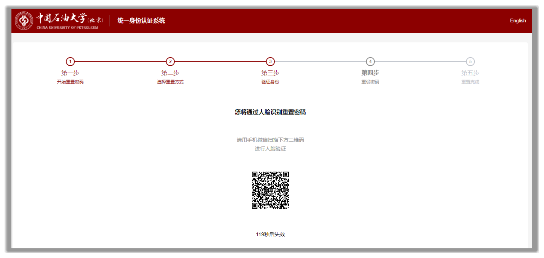 点击刷脸重置后即可使用手机扫码进行人脸识别,具体操作与注册过程的人脸识别操作一致,人脸识别成功即可进入下一步重新设置密码;