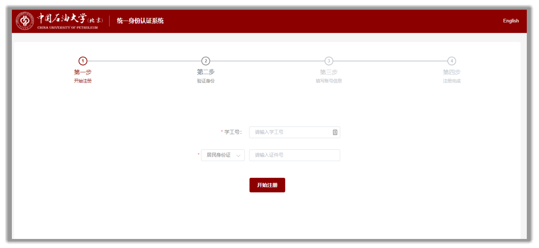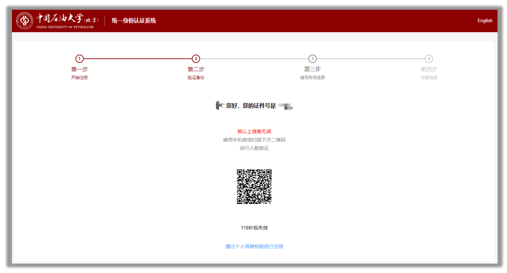2、根据页面提示填写“学工号”,选择对应“证件类型”并填写证件号码,点击下一步,若验证未通过请仔细检查填写信息是否有误,若验证通过则进入二维码扫码页面。