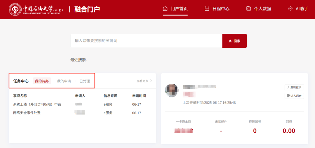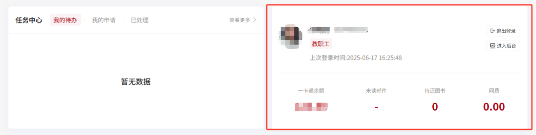 4、个人数据看板:实时显示人脸照片、工号、一卡通余额、未读邮件、待还图书、网费等信息,点击数据直达对应系统。