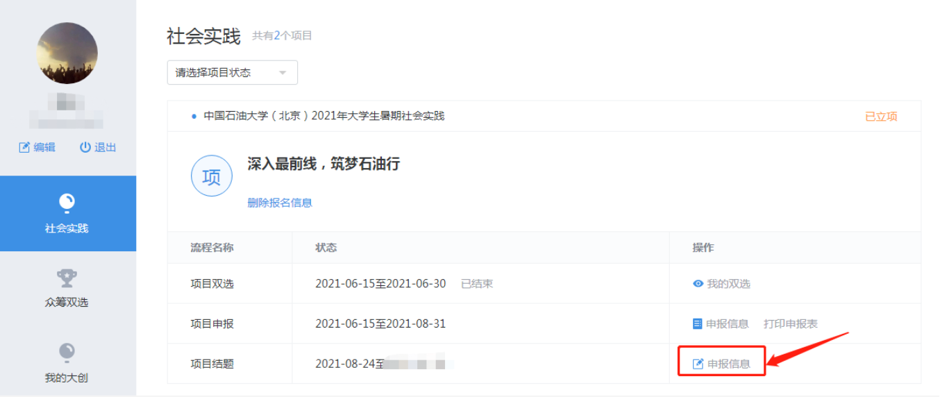 8月23日23:00前,实践成果包括实践总结、调研报告或论文、访谈记录、观察报告或工作报告、照片、视频等资料。所有实践团队按要求认真整理总结实践成果(具体要求见《附件1:实践成果收集说明》),由队长从电脑端登录http://sct.dgqinyehang.com/,到个人中心项目结题-申报信息处填报。