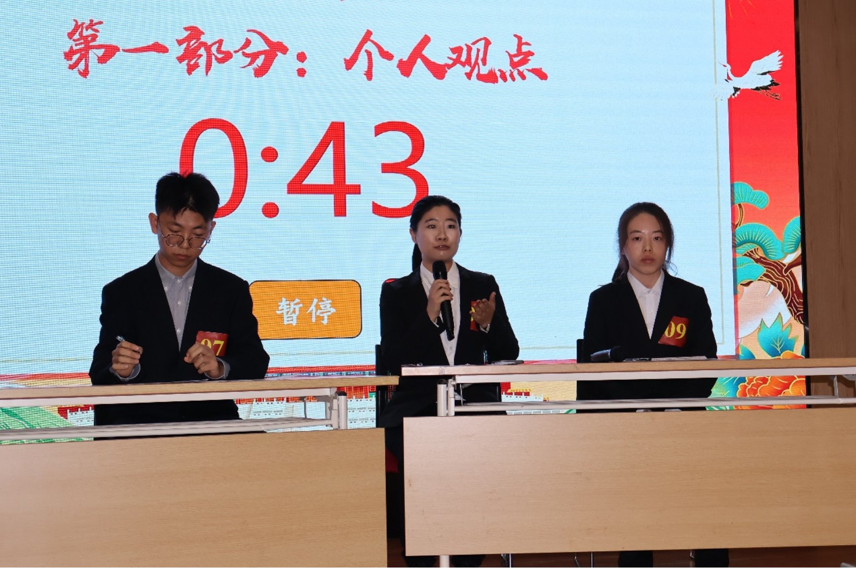 第二个环节为“模拟群面”。9名选手依次分为三组,在规定时间和特定情境下完成个人观点表述、小组自由讨论、代表总结陈述。三组选手在自由讨论中进行思想碰撞,在互动和反馈下形成了积极、有序的讨论氛围,由代表同学总结发言,提出了集思广益的建议。