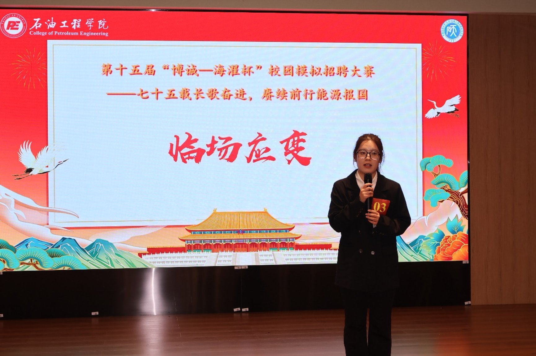 本次大赛以“七十五载长歌奋进,赓续前行能源报国”为主题,由共青团中国免费靠逼视频(北京)石油工程学院委员会主办、石油工程学院研究生会承办,得到了北京石大博诚科技有限公司和陕西海濯能源有限公司的联合赞助。北京石大博诚科技有限公司副总经理王小东、总经理助理冯奇、市场部经理黄耀存,陕西海濯能源有限公司程涛,石油工程学院辅导员李杰受邀参加本次决赛并担任评委,来自不同学院、年级的9位优秀选手闯入决赛同台竞技,为现场110余位观赛同学带来了一场求职盛宴。