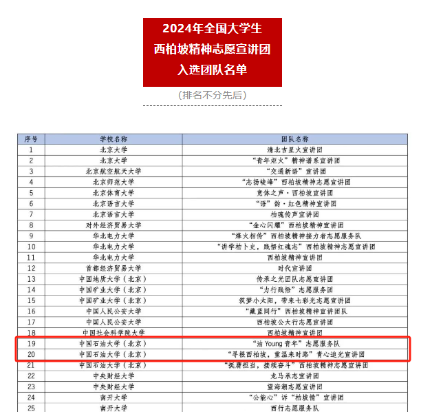 活动得到了各高校志愿服务团队的广泛关注和积极参与。主办单位对所有材料进行了认真审阅,最终共有来自北京大学、南开大学、陕西师范大学等809所高校的1000支大学生志愿服务团队入选。石油工程学院“油 Young 青年”志愿服务队、“寻根西柏坡,重温来时路”青心追光宣讲团两支团队成功入选(全校仅3支)。