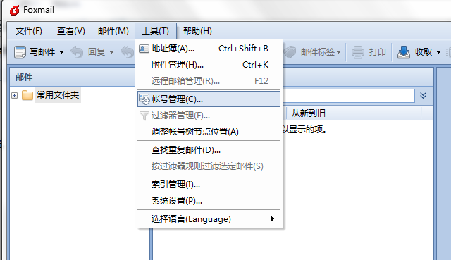 常见问题科普 首页» 常见问题科普» 邮箱相关 邮箱相关 【常见问题】如何在FoxMail中新建邮件账户? 来源:信息技术中心 发布日期: 2013-03-06 阅读次数: 第一步: 打开Foxmail,进入“工具”—“账号管理”: 点击左下角“新建”: 输入需要配置的邮箱: 若此处接收服务器端口配置不正确,可以在“工具”—“账号管理”—“服务器”中修改: