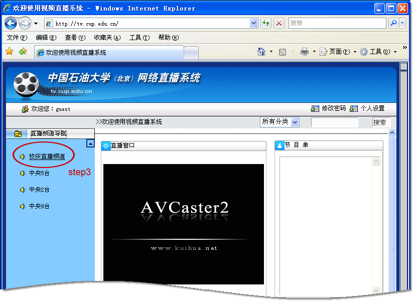 中国石油大学(北京)视频直播系统的固定网址为:http://tv.dgqinyehang.com.如下图Step1所示,先进入该页面.