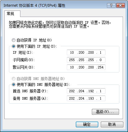5、在“常规”下选择“使用下面的IP地址”,输入注册的地址信息,比如IP地址:10.200.200.1、子网掩码:255.255.255.0、默认网关:10.200.200.254;再选择中“使用下面的DNS服务器地址”,然后输入首选DNS服务器:202.204.192.1和备选DNS服务器:202.204.193.1,然后点击[确定]完成全部设置。