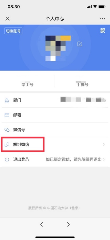 第一步:进入微信企业号,找到微校园助手,进行当前登录身份解绑:进入微校园助手,点击用户注册,选择解绑微信,清除账号在企业号上的缓存。