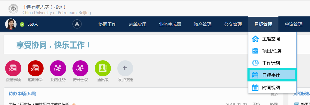 新建日程事件点击一级菜单【目标管理】 --【日程事件】,进入日程事件的操作界面。