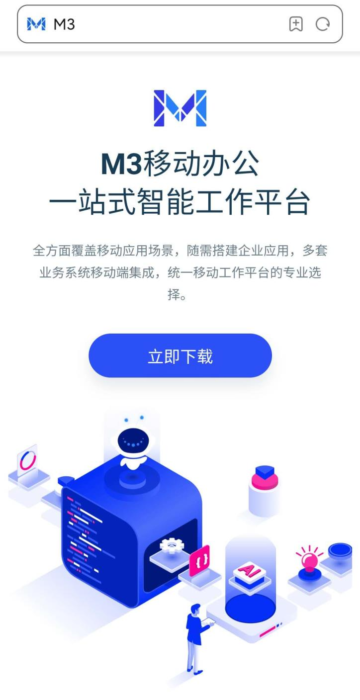 方法一: 通过手机进入 http://m3.seeyon.com, 打开页面, 点击【立即下载】 ,下载安装包安装。