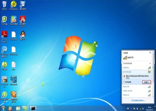 左键点击桌面右下角网络连接图标会弹出网络连接窗口,从窗口列表中选择无线网络名“CUP-WLAN”点击连接,等待连接成功。