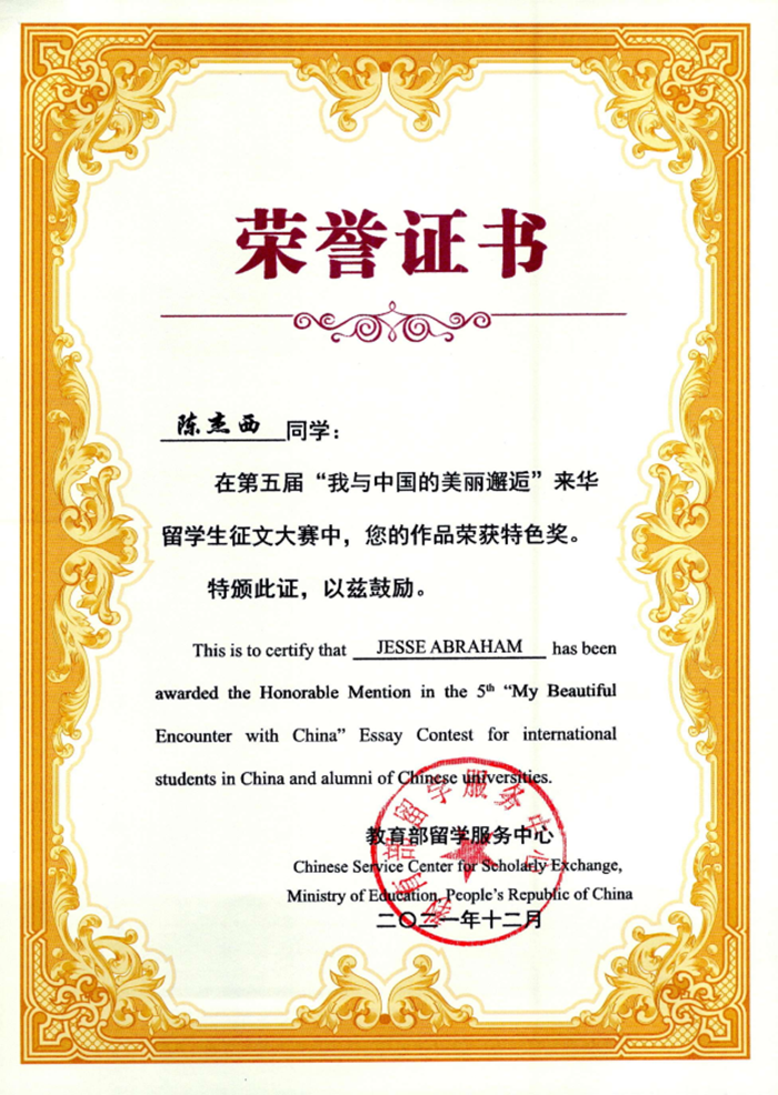12月21日,第五届《我与中国的美丽邂逅》来华留学生征文暨短视频大赛颁奖典礼以线上形式成功举办。此次活动由教育部国际合作与交流司主办,教育部留学服务中心承办,旨在促进不同国家青年一代的人文交流,展示各国来华留学生风采,发掘留学生朋友们感人至深的中国故事。