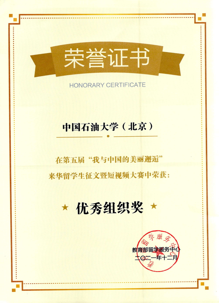 中石大国际教育学院获第五届《我与中国的美丽邂逅》来华留学生征文暨短视频大赛优秀组织奖,印度尼西亚籍学生陈杰西的作品《中国——已苏醒的狮子》获第五届“我与中国的美丽邂逅”征文大赛特色奖。今年,中石大国际教育学院积极组织学生参加第五届“我与中国的美丽邂逅”来华留学生征文暨短视频大赛,共向此次大赛提交了20余份作品。