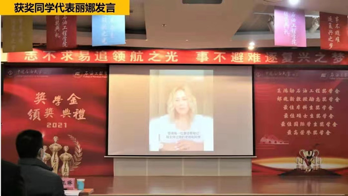 其中,2018级本科国际学生丽娜荣获“最佳国际学生奖学金”。丽娜今年22岁,来自俄罗斯联邦,目前是石油工程专业四年级本科生。在学期间,她积极参加各类活动和竞赛,综合表现优异。因丽娜目前在俄罗斯,在本次颁奖典礼上,她作为获奖代表作视频发言,分享了自己的学习经历和获奖感受,展现了国际学生饱满的精神面貌和优秀的综合素质。