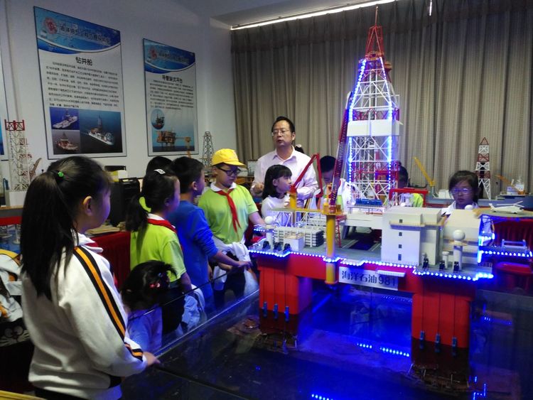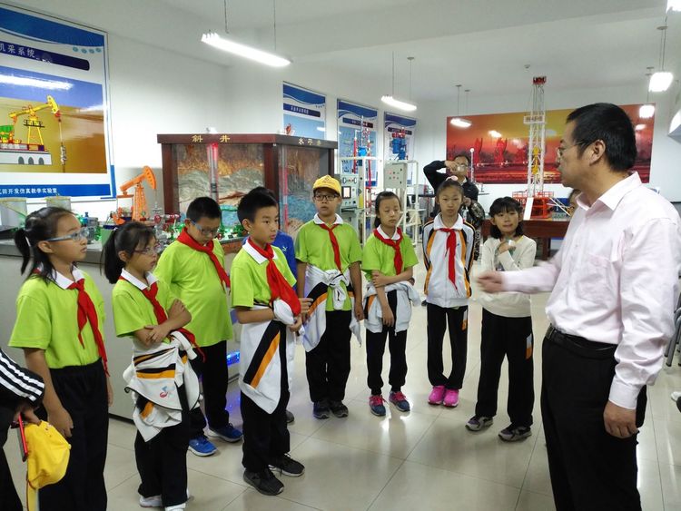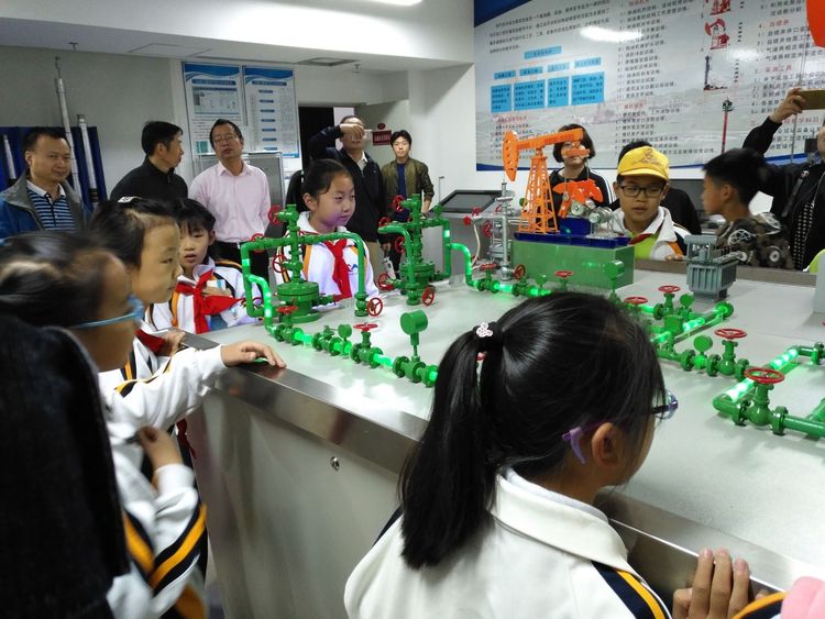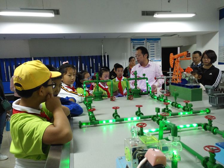 接下来小朋友们来到了钻井仿真实验室,实验室负责人朱老师的讲解深入浅出,迅速的地吸引了所有人的注意力,他从“如何来找石油,怎么来采石油,石油开采后如何运输?”这三个问题展开,紧紧捉住了我们的好奇心和求知欲。我们好奇的仔细观看着,内心已经对以前遥不可及的石油开采有了初步了解和认知。