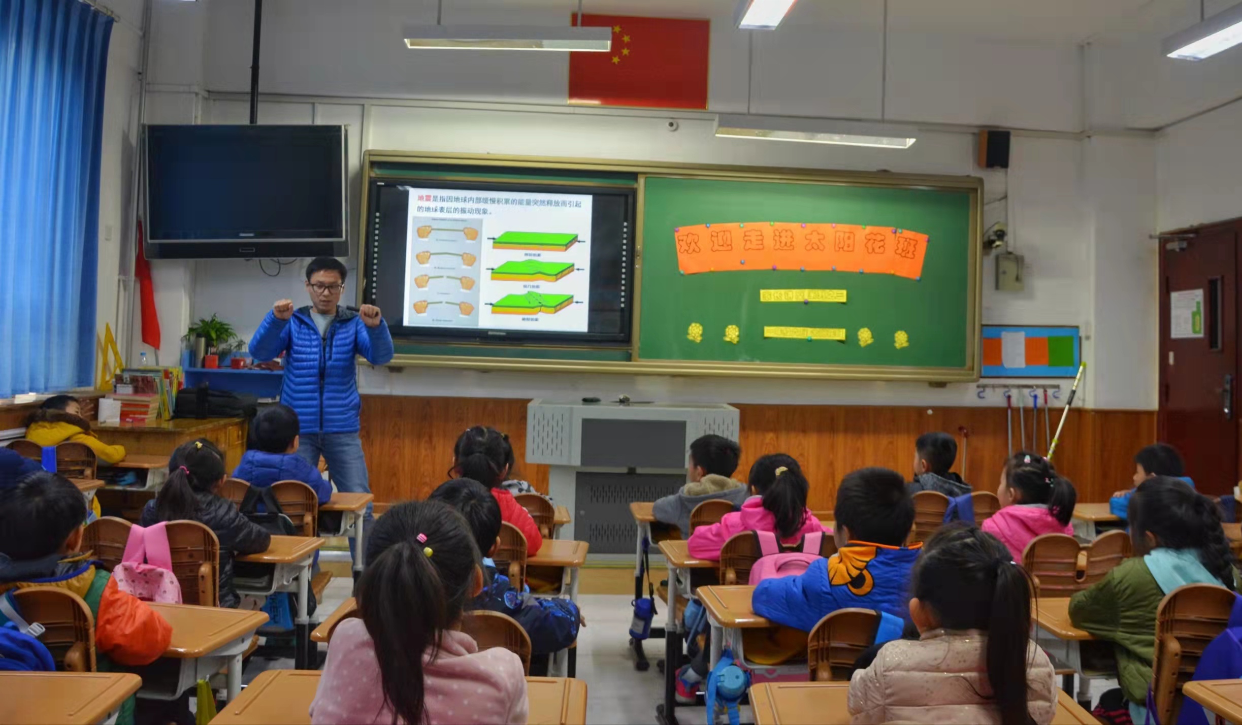 “我们能够生活在这美丽的蓝色地球上,是无比幸福的,因为这里有高山、有海洋、有阳光、有鲜花,还有可爱的小动物们。但是,地球经过几十亿年的演化,有着复杂的地质结构,它有时候也会发泄“小脾气”——地震。你们了解地震吗?我们又该如何在地震来临时保护好自己呢?”讲堂伊始抛出两个问题,让学生们对此产生了浓厚的兴趣及引起积极的思考。接着罗泽熙爸爸用简单的语言及生动的视频诠释了什么是地震?地球就像是一个能量球,它的内部缓慢积累的能量突然释放就会引起地球表面的震动,震源深度浅、震级高的地震会给人类带来很大的伤害。