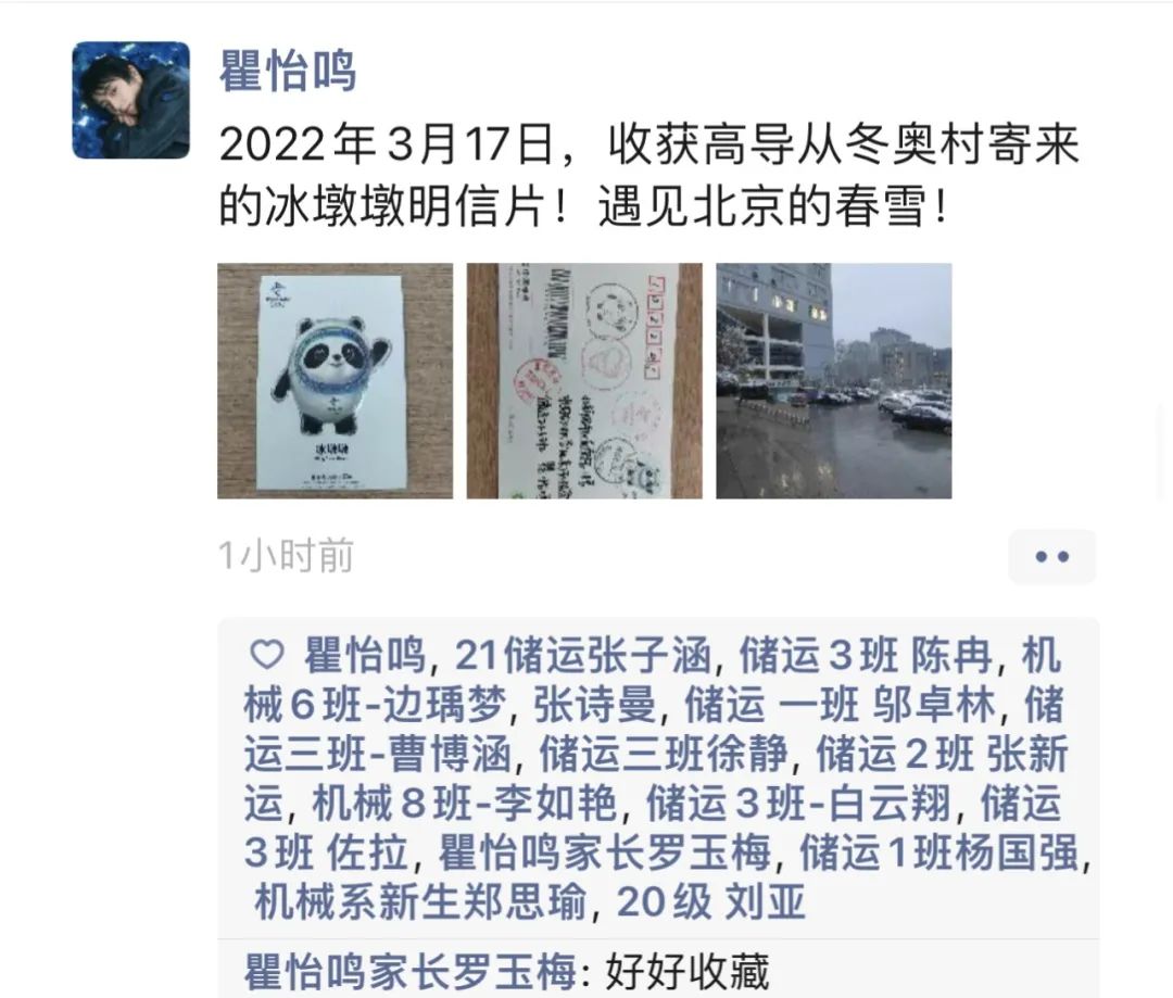 油气储运工程2021级本科生蔡文灏说,冰与春雪,雪和容融,百张明信片带着冬奥的印记,跨越山海来到我们手中。冬奥村与中石大,冬奥志愿者和石大学子,导员和我们,这些不仅是一份挂念,更是一种缘分。冬奥已过,春雪降临,疫情无法隔断相连的心,我们牵手相约,一起向未来!