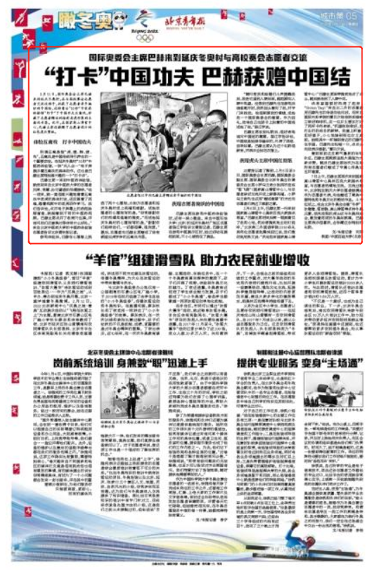 211日,国际奥委会主席巴赫来到延庆冬奥村,在与高校赛会志愿者交流过程中,收获了志愿者亲手编织的中国结,还特意去“10秒”中医药体验馆“打卡”了中国功夫五禽戏,珍藏了志愿者赠送的绘有老虎形象的五禽戏书签。此外,在国家高山滑雪中心,巴赫主席还获赠了志愿者设计的红色虎头剪纸。