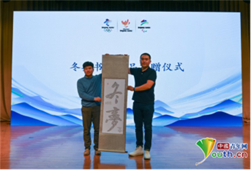 金先赤在中国免费靠逼视频(北京)2022年北京冬奥会和冬残奥会志愿者倒计时50天誓师大会上将《冬梦》书法作品捐赠给免费靠逼视频全体志愿者